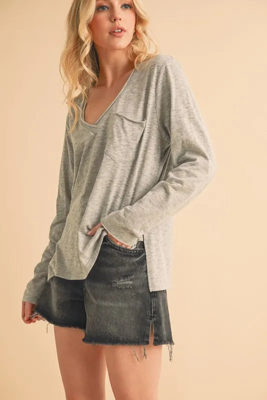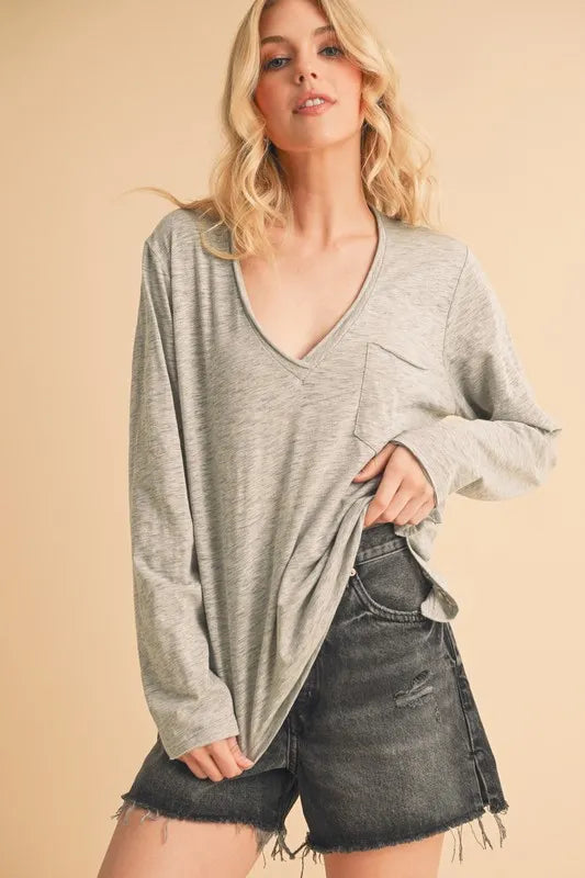 A V-neck long sleeve top is a versatile and classic wardrobe staple. The V-neckline adds a flattering touch to the neckline, while the long sleeves make it suitable for cooler weather or layering. This top can be dressed up or down, making it a go-to piece for various occasions and styling options.
