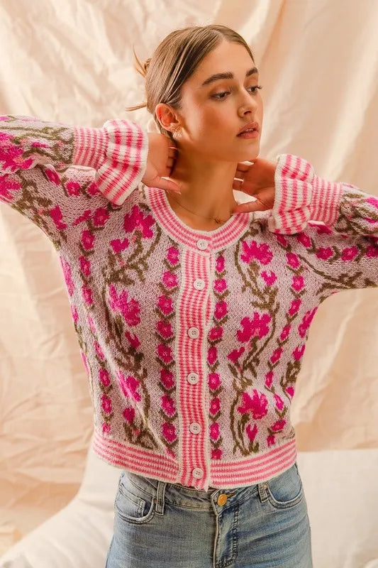 SO ME Floral Intarsia Button Up Sweater Cardigan