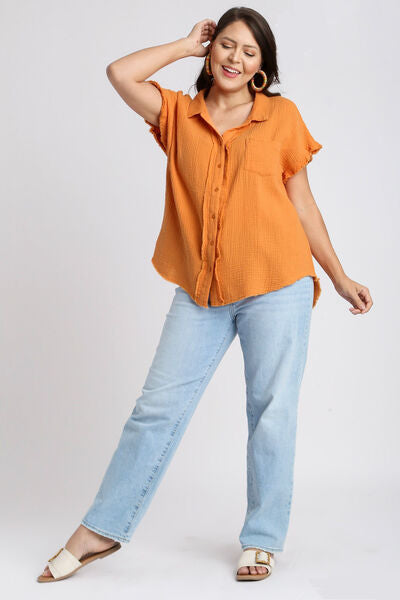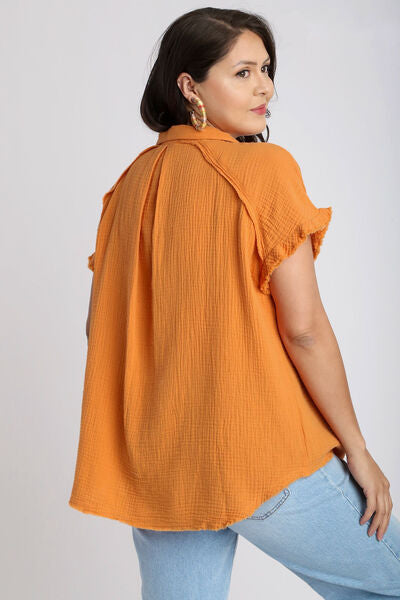 A Frayed Hem Collared Neck Short Sleeve Shirt is a versatile and on-trend piece to add to your wardrobe. The collared neck gives a polished and classic look, while the frayed hem adds a touch of casual and edgy style. This shirt can be dressed up with tailored pants or a skirt for a more professional outfit, or it can be paired with jeans or shorts for a chic and laid-back look. The combination of the structured collar and the playful frayed hem creates a unique and fashionable statement piece for your wardrobe.