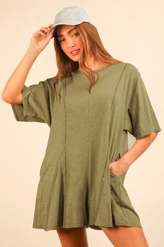 A mineral washed oversized knit comfy romper is a cozy and stylish one-piece outfit option. The mineral washing technique gives the fabric a vintage and lived-in look, while the oversized fit provides comfort and a relaxed feel. This romper is perfect for lounging at home or casual outings. Pair it with sneakers or sandals for a laid-back and effortless look that still exudes style and comfort.
