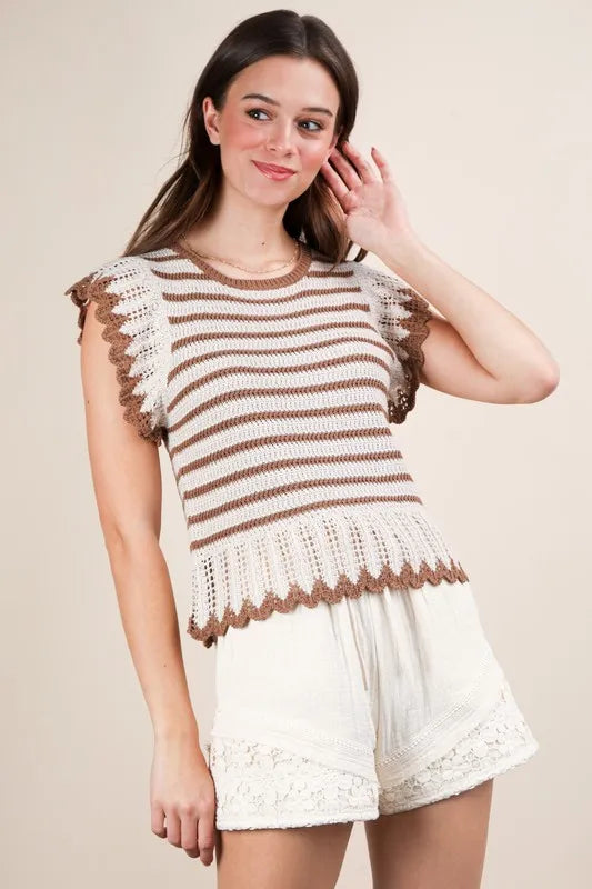 A ruffled detail striped knit sweater top combines texture and style effortlessly. The stripes add a classic touch, while the ruffles bring a feminine flair. This versatile top can be dressed up or down for any occasion.