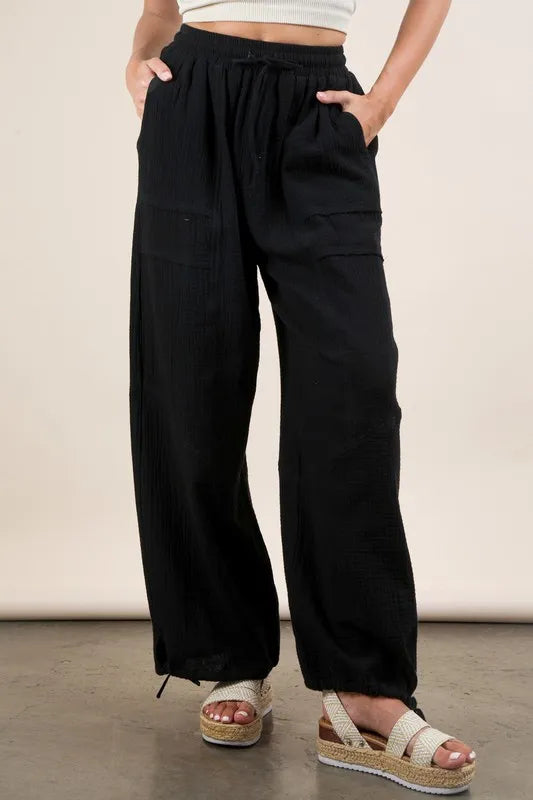 Wide leg gauze solid pants are loose-fitting trousers made from a lightweight and airy gauze fabric. With a wide leg silhouette, these pants offer a relaxed and comfortable fit while providing a breezy feel for warm weather. The solid color adds versatility, allowing these pants to be easily paired with various tops for a chic and effortless look.