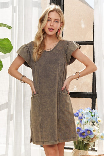 ADORA Mineral Washed V-Neck Ruffled Cap Sleeve Dress